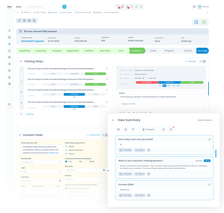 monitor sales stages, upload documents, monitor activity and view the summary of everything with one click.