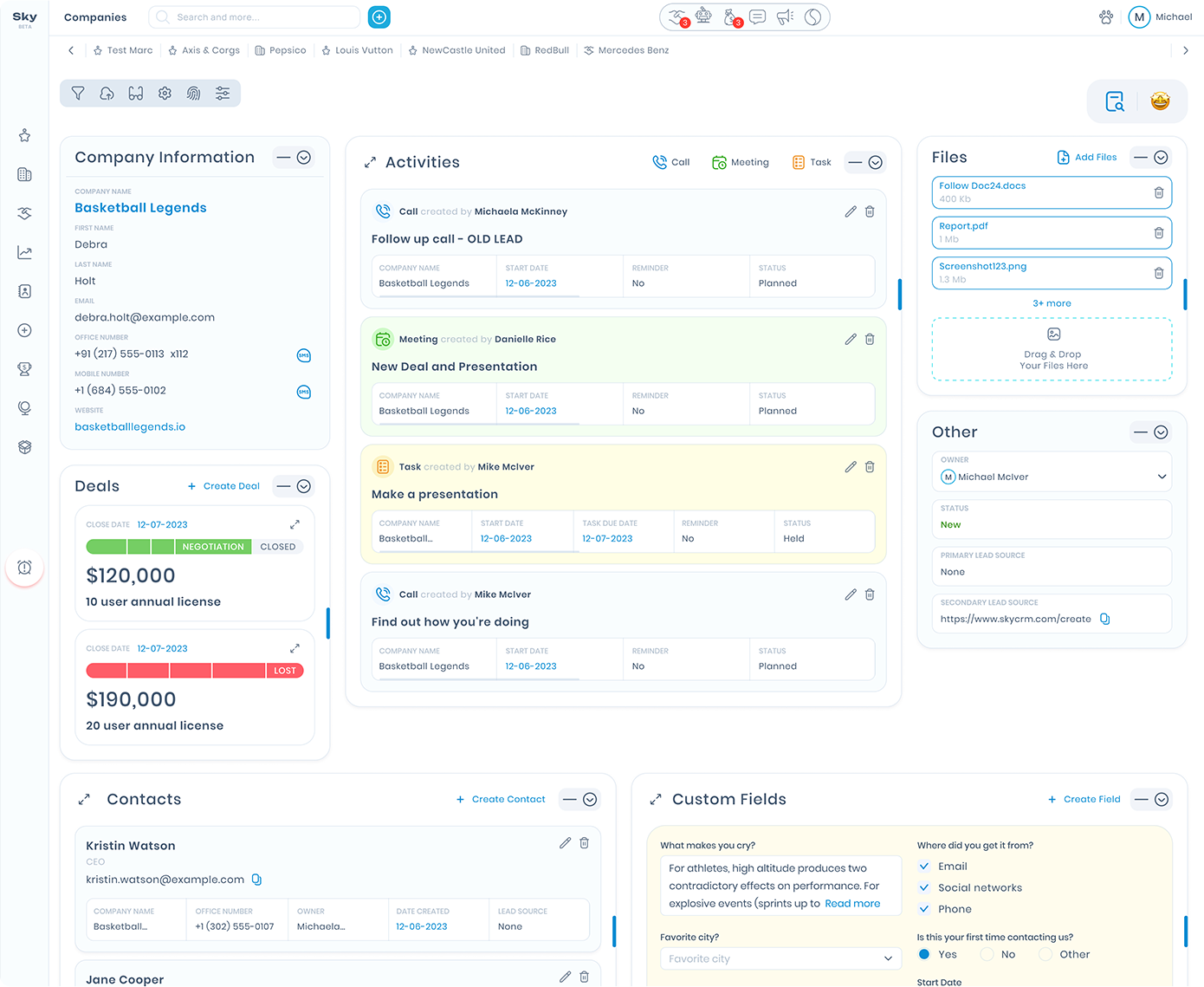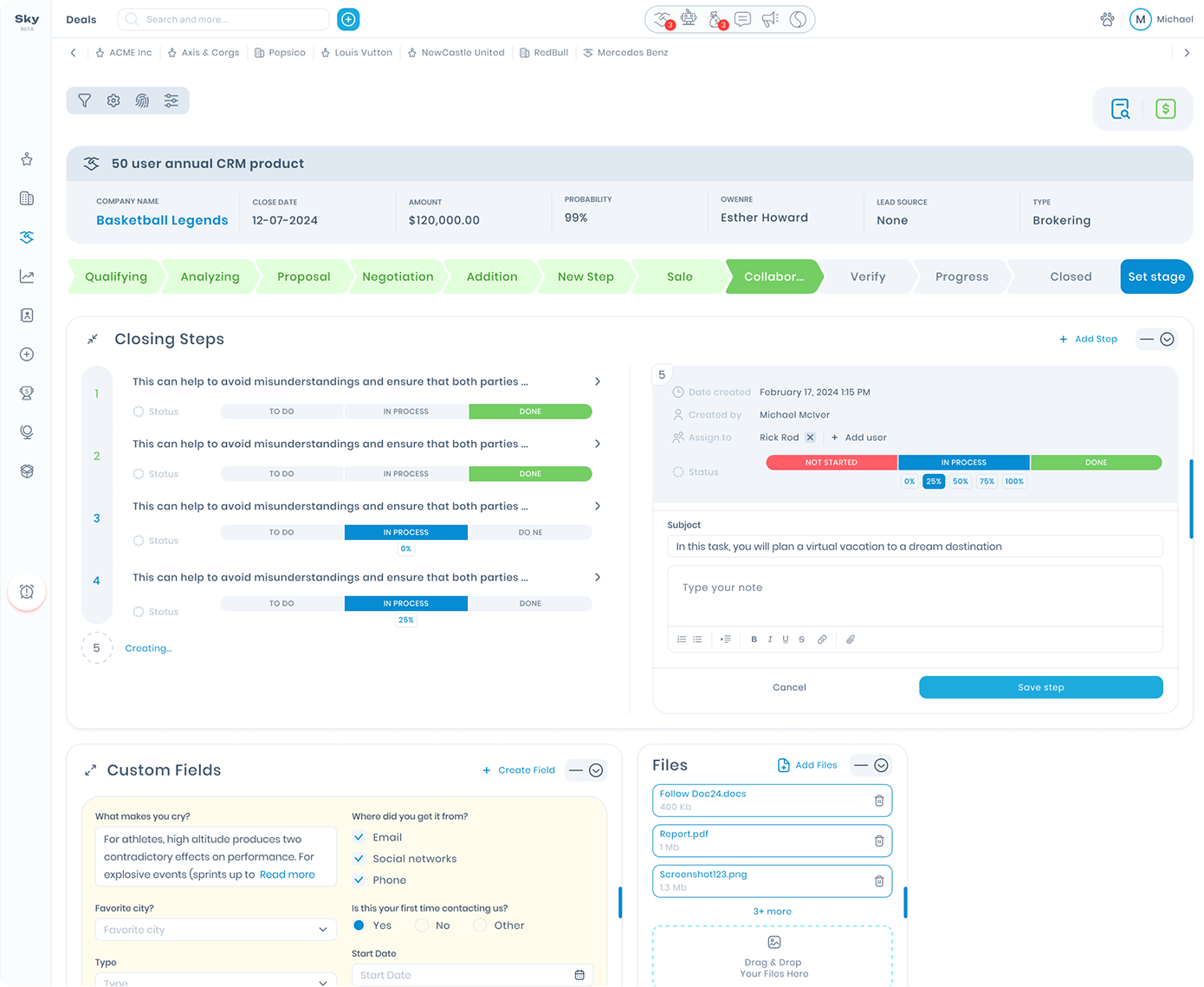 monitor sales stages, upload documents, monitor activity and view the summary of everything with one click.